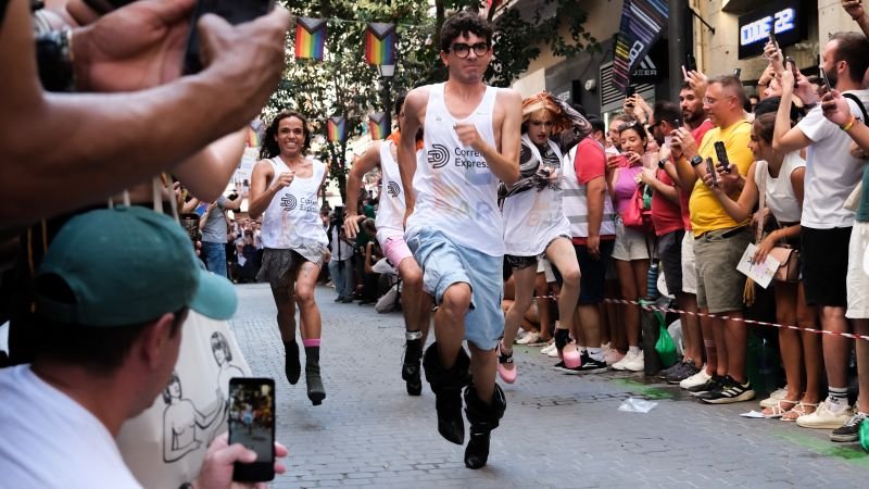 Spectators gathered on the cobblestone streets of Madrid’s Chueca neighborhood this week to watch one of Spain’s most curious races: the “Carrera de Tacones,” or heel race.