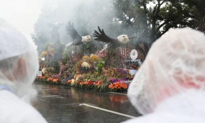 Rained poured down on the iconic Rose Parade on Thursday for the first time in 20 years, as flood warnings and evacuation orders in Southern California...