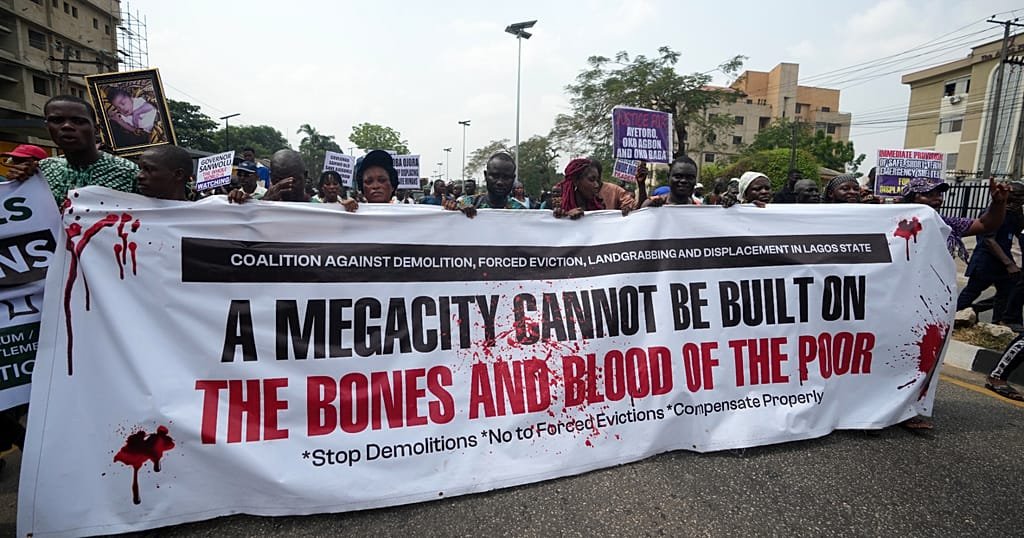The protesters, made up of displaced residents from waterfront and informal settlements, gathered near a major road in Lagos to accuse authorities of demolishing their homes without adequate notice, compensation or resettlement plans.